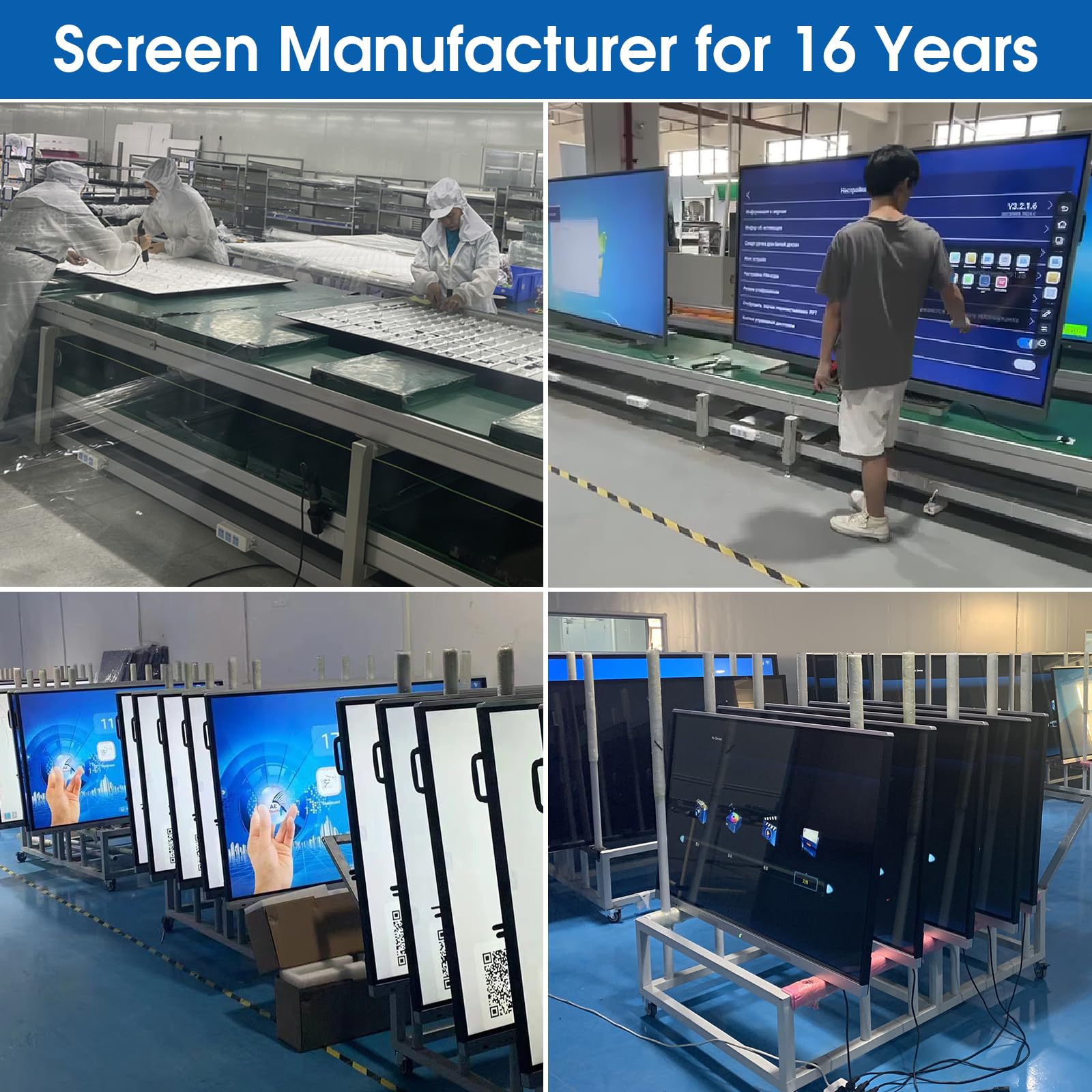 PROFESSIONAL MANUFACTURER: We are a manufacturer specializing in the production of large touchscreens, committed to providing customers with high-quality, affordable interactive touch screens. We have 16 years of design, production and transportation experience to ensure that our products can be delivered to customers safely and perfectly.