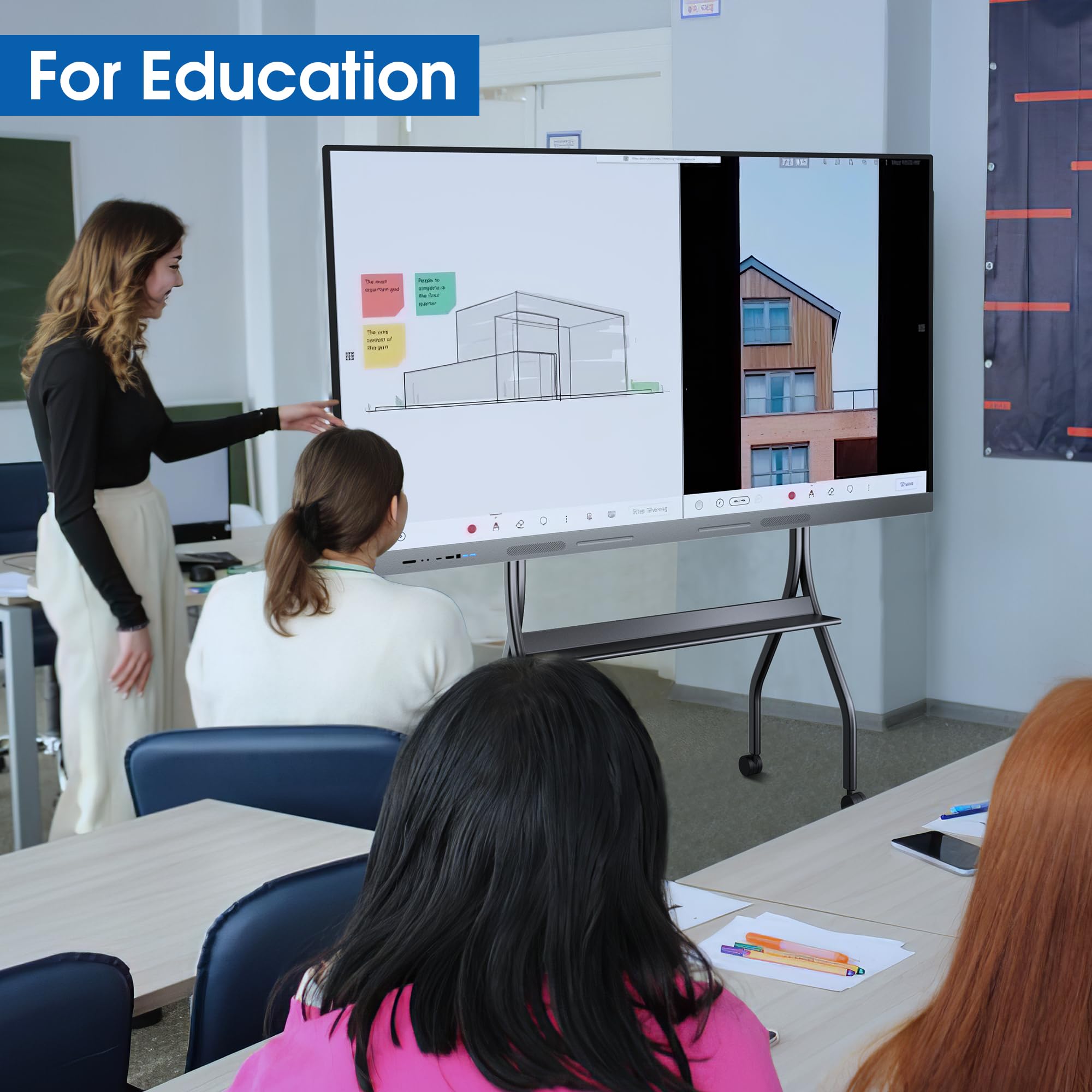 4K UHD TOUCHSCREEN:The smart board allows for clear visibility of content and ensures that all participants can easily see and interact with the board. The touchscreen is responsive and accurate(response time 6ms max), ensuring smooth interaction and precise writing or drawing.