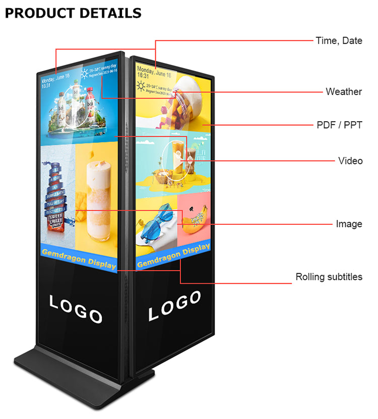 Gemdragon’s Double Sided Digital Display offers a sophisticated and versatile advertising solution for modern businesses. This ultra-thin, floor-standing digital signage is designed to captivate audiences from both sides, making it perfect for high-traffic areas. Available in various sizes and colors, and supporting multiple operating systems, this display is an ideal choice for dynamic and engaging advertising.